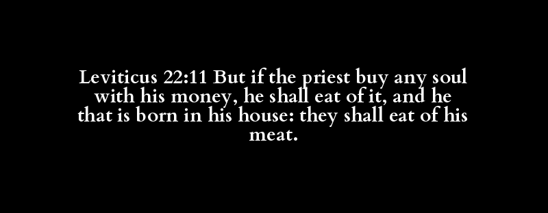 Leviticus 22:11 But if the priest buy any soul with his money, he shall eat of it, and he that is born in his house: they shall eat of his meat.