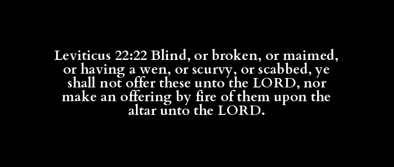 Leviticus 22:22 Blind, or broken, or maimed, or having a wen, or scurvy, or scabbed, ye shall not offer these unto the LORD, nor make an offering by fire of them upon the altar unto the LORD.