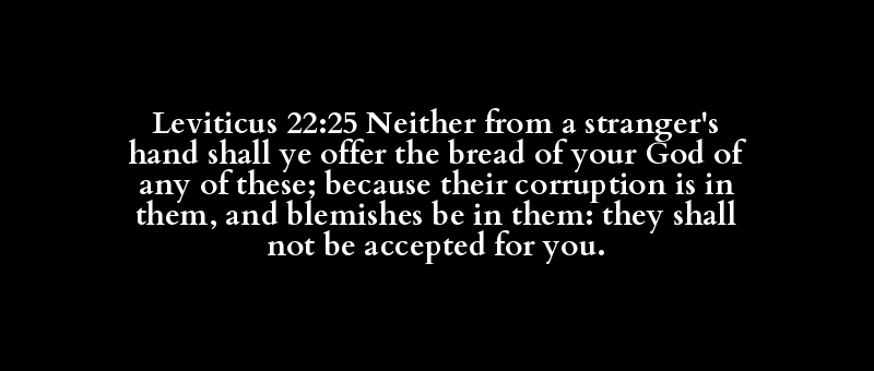 Leviticus 22:25 Neither from a stranger's hand shall ye offer the bread of your God of any of these; because their corruption is in them, and blemishes be in them: they shall not be accepted for you.