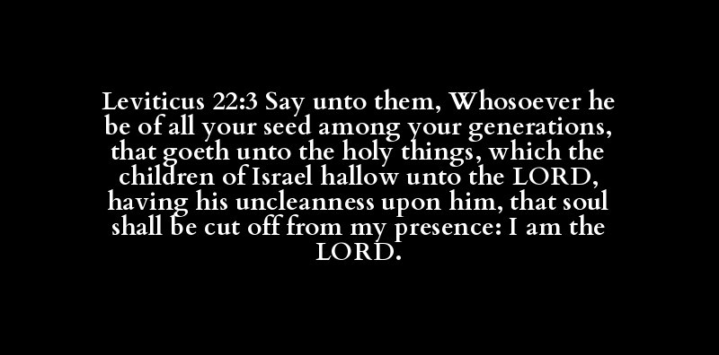 Leviticus 22:3 Say unto them, Whosoever he be of all your seed among your generations, that goeth unto the holy things, which the children of Israel hallow unto the LORD, having his uncleanness upon him, that soul shall be cut off from my presence: I am the LORD.