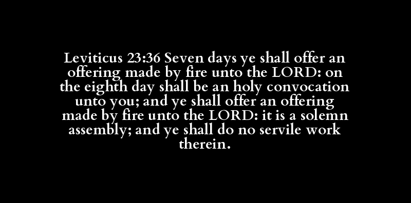 Leviticus 23:36 Seven days ye shall offer an offering made by fire unto the LORD: on the eighth day shall be an holy convocation unto you; and ye shall offer an offering made by fire unto the LORD: it is a solemn assembly; and ye shall do no servile work therein.