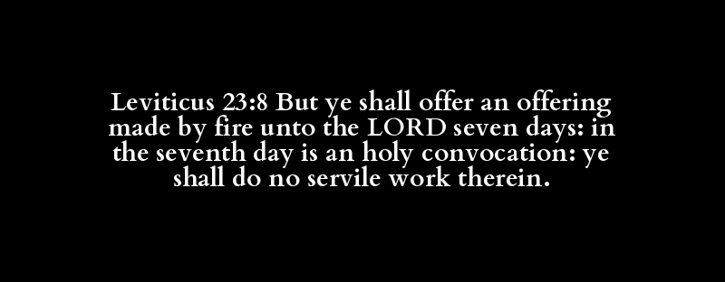 Leviticus 23:8 But ye shall offer an offering made by fire unto the LORD seven days: in the seventh day is an holy convocation: ye shall do no servile work therein.
