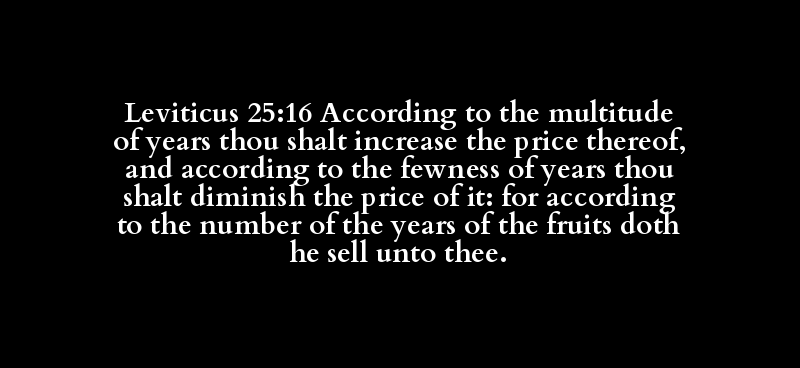 Leviticus 25:16 According to the multitude of years thou shalt increase the price thereof, and according to the fewness of years thou shalt diminish the price of it: for according to the number of the years of the fruits doth he sell unto thee.
