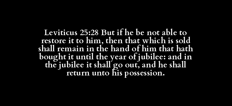 Leviticus 25:28 But if he be not able to restore it to him, then that which is sold shall remain in the hand of him that hath bought it until the year of jubilee: and in the jubilee it shall go out, and he shall return unto his possession.