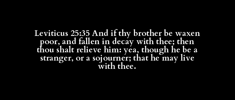 Leviticus 25:35 And if thy brother be waxen poor, and fallen in decay with thee; then thou shalt relieve him: yea, though he be a stranger, or a sojourner; that he may live with thee.