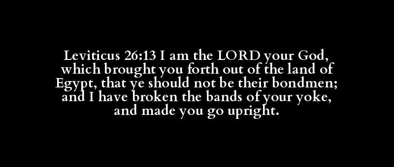 Leviticus 26:13 I am the LORD your God, which brought you forth out of the land of Egypt, that ye should not be their bondmen; and I have broken the bands of your yoke, and made you go upright.