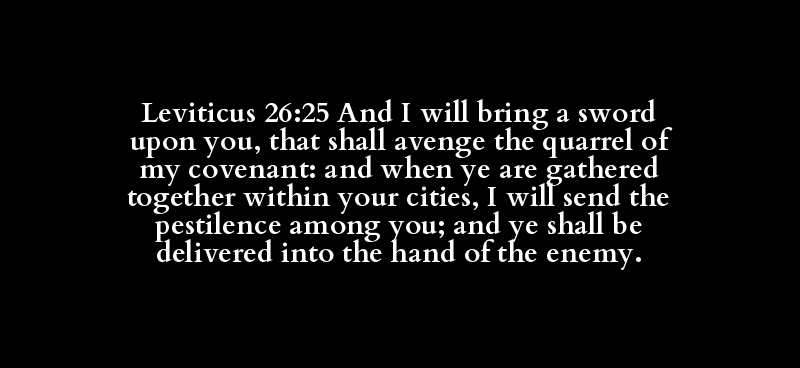 Leviticus 26:25 And I will bring a sword upon you, that shall avenge the quarrel of my covenant: and when ye are gathered together within your cities, I will send the pestilence among you; and ye shall be delivered into the hand of the enemy.