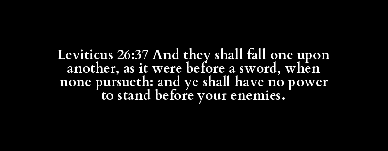 Leviticus 26:37 And they shall fall one upon another, as it were before a sword, when none pursueth: and ye shall have no power to stand before your enemies.