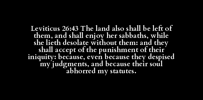 Leviticus 26:43 The land also shall be left of them, and shall enjoy her sabbaths, while she lieth desolate without them: and they shall accept of the punishment of their iniquity: because, even because they despised my judgments, and because their soul abhorred my statutes.