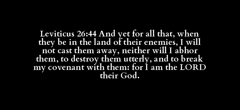 Leviticus 26:44 And yet for all that, when they be in the land of their enemies, I will not cast them away, neither will I abhor them, to destroy them utterly, and to break my covenant with them: for I am the LORD their God.