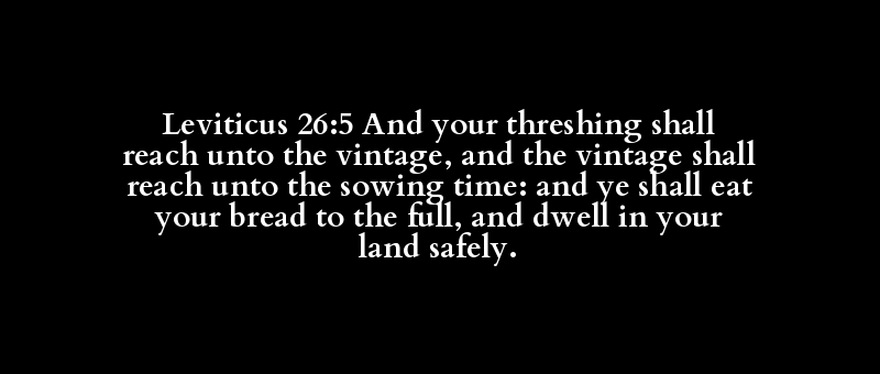Leviticus 26:5 And your threshing shall reach unto the vintage, and the vintage shall reach unto the sowing time: and ye shall eat your bread to the full, and dwell in your land safely.