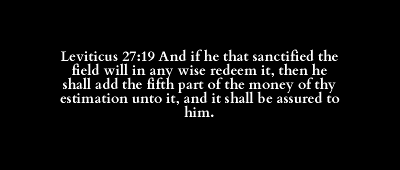 Leviticus 27:19 And if he that sanctified the field will in any wise redeem it, then he shall add the fifth part of the money of thy estimation unto it, and it shall be assured to him.