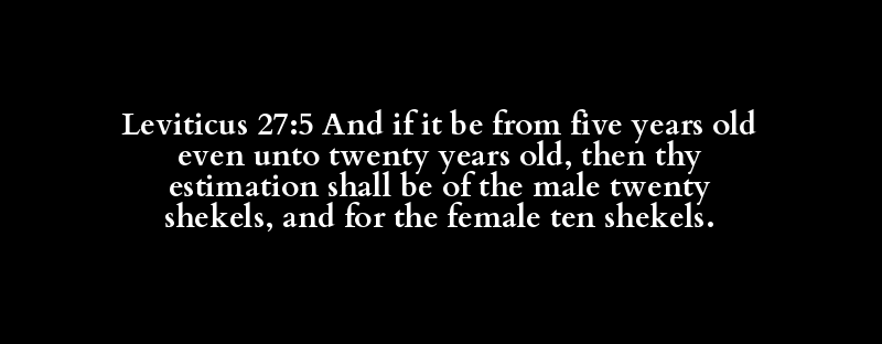 Leviticus 27:5 And if it be from five years old even unto twenty years old, then thy estimation shall be of the male twenty shekels, and for the female ten shekels.