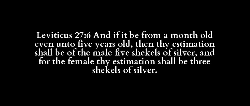 Leviticus 27:6 And if it be from a month old even unto five years old, then thy estimation shall be of the male five shekels of silver, and for the female thy estimation shall be three shekels of silver.