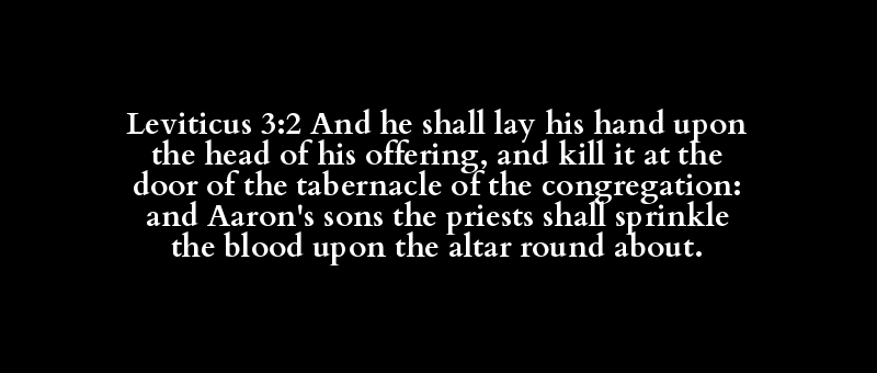 Leviticus 3:2 And he shall lay his hand upon the head of his offering, and kill it at the door of the tabernacle of the congregation: and Aaron's sons the priests shall sprinkle the blood upon the altar round about.