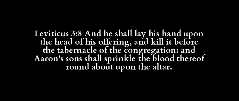 Leviticus 3:8 And he shall lay his hand upon the head of his offering, and kill it before the tabernacle of the congregation: and Aaron's sons shall sprinkle the blood thereof round about upon the altar.