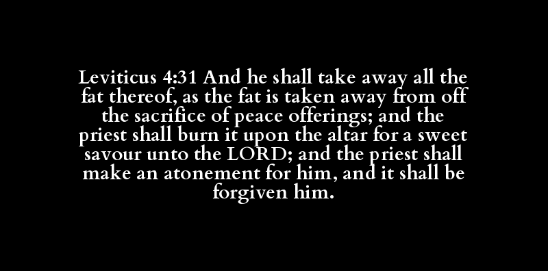Leviticus 4:31 And he shall take away all the fat thereof, as the fat is taken away from off the sacrifice of peace offerings; and the priest shall burn it upon the altar for a sweet savour unto the LORD; and the priest shall make an atonement for him, and it shall be forgiven him.