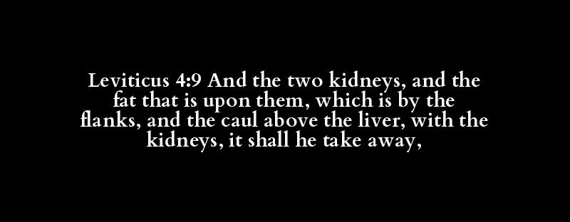 Leviticus 4:9 And the two kidneys, and the fat that is upon them, which is by the flanks, and the caul above the liver, with the kidneys, it shall he take away,