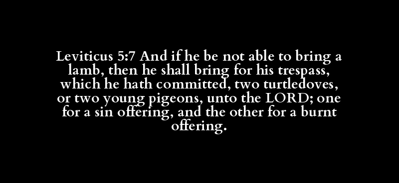 Leviticus 5:7 And if he be not able to bring a lamb, then he shall bring for his trespass, which he hath committed, two turtledoves, or two young pigeons, unto the LORD; one for a sin offering, and the other for a burnt offering.