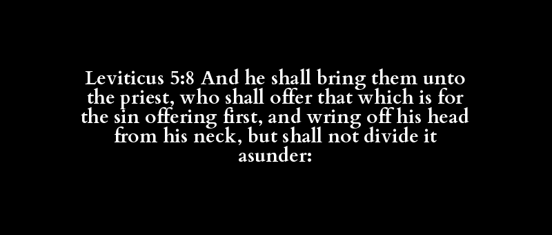 Leviticus 5:8 And he shall bring them unto the priest, who shall offer that which is for the sin offering first, and wring off his head from his neck, but shall not divide it asunder: