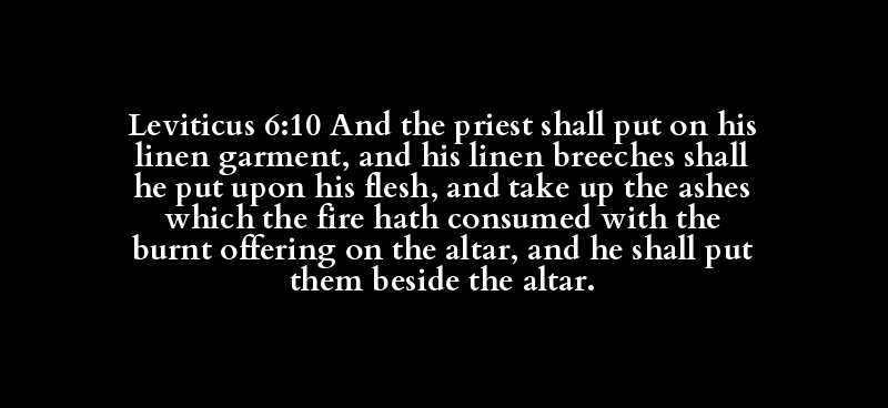 Leviticus 6:10 And the priest shall put on his linen garment, and his linen breeches shall he put upon his flesh, and take up the ashes which the fire hath consumed with the burnt offering on the altar, and he shall put them beside the altar.