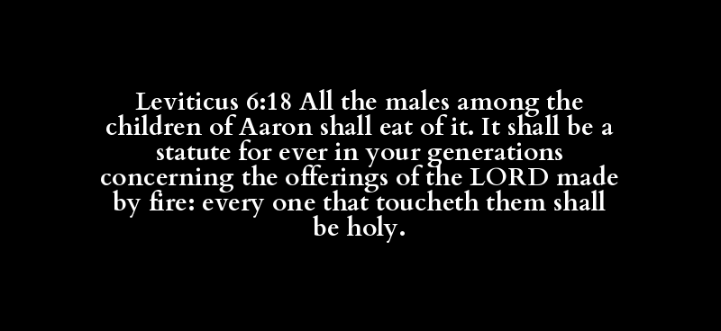 Leviticus 6:18 All the males among the children of Aaron shall eat of it. It shall be a statute for ever in your generations concerning the offerings of the LORD made by fire: every one that toucheth them shall be holy.