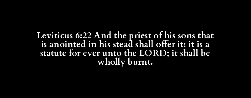 Leviticus 6:22 And the priest of his sons that is anointed in his stead shall offer it: it is a statute for ever unto the LORD; it shall be wholly burnt.