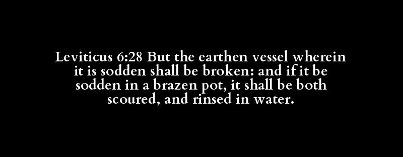 Leviticus 6:28 But the earthen vessel wherein it is sodden shall be broken: and if it be sodden in a brazen pot, it shall be both scoured, and rinsed in water.