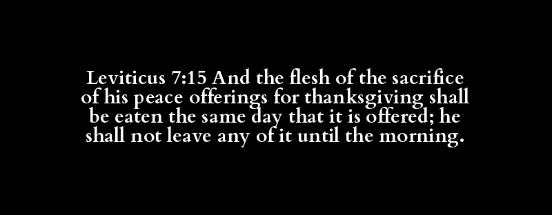 Leviticus 7:15 And the flesh of the sacrifice of his peace offerings for thanksgiving shall be eaten the same day that it is offered; he shall not leave any of it until the morning.
