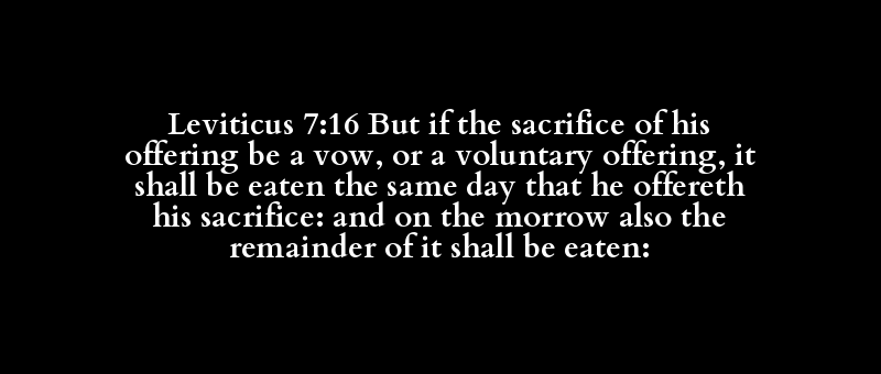 Leviticus 7:16 But if the sacrifice of his offering be a vow, or a voluntary offering, it shall be eaten the same day that he offereth his sacrifice: and on the morrow also the remainder of it shall be eaten: