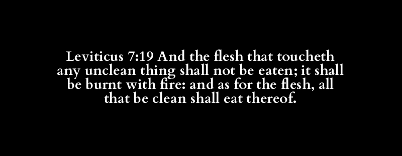 Leviticus 7:19 And the flesh that toucheth any unclean thing shall not be eaten; it shall be burnt with fire: and as for the flesh, all that be clean shall eat thereof.