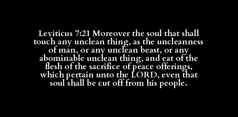 Leviticus 7:21 Moreover the soul that shall touch any unclean thing, as the uncleanness of man, or any unclean beast, or any abominable unclean thing, and eat of the flesh of the sacrifice of peace offerings, which pertain unto the LORD, even that soul shall be cut off from his people.