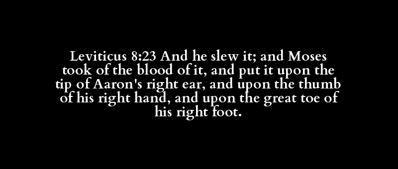 Leviticus 8:23 And he slew it; and Moses took of the blood of it, and put it upon the tip of Aaron's right ear, and upon the thumb of his right hand, and upon the great toe of his right foot.