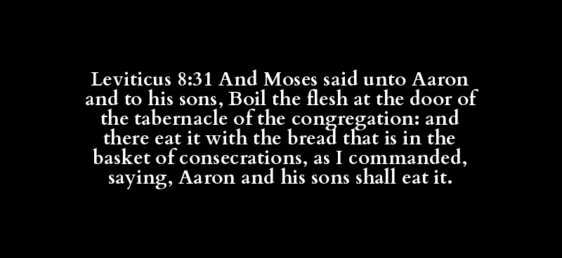 Leviticus 8:31 And Moses said unto Aaron and to his sons, Boil the flesh at the door of the tabernacle of the congregation: and there eat it with the bread that is in the basket of consecrations, as I commanded, saying, Aaron and his sons shall eat it.