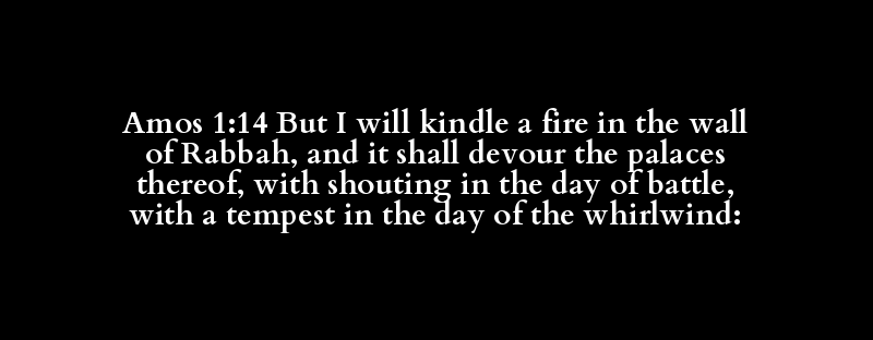 Amos 1:14 But I will kindle a fire in the wall of Rabbah, and it shall devour the palaces thereof, with shouting in the day of battle, with a tempest in the day of the whirlwind: