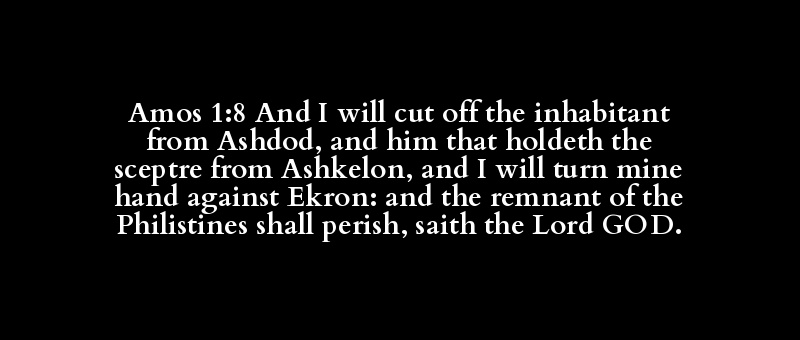 Amos 1:8 And I will cut off the inhabitant from Ashdod, and him that holdeth the sceptre from Ashkelon, and I will turn mine hand against Ekron: and the remnant of the Philistines shall perish, saith the Lord GOD.