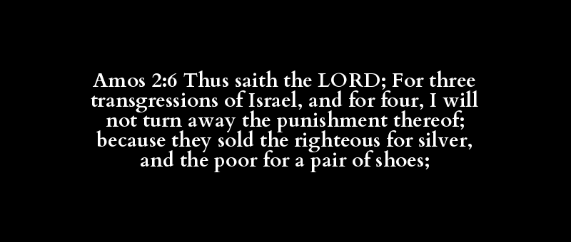 Amos 2:6 Thus saith the LORD; For three transgressions of Israel, and for four, I will not turn away the punishment thereof; because they sold the righteous for silver, and the poor for a pair of shoes;