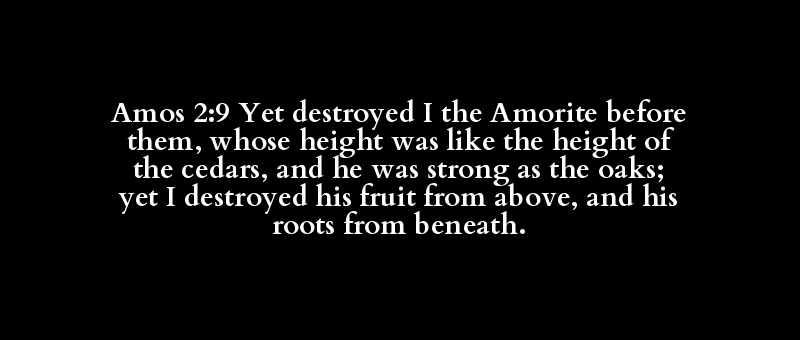 Amos 2:9 Yet destroyed I the Amorite before them, whose height was like the height of the cedars, and he was strong as the oaks; yet I destroyed his fruit from above, and his roots from beneath.
