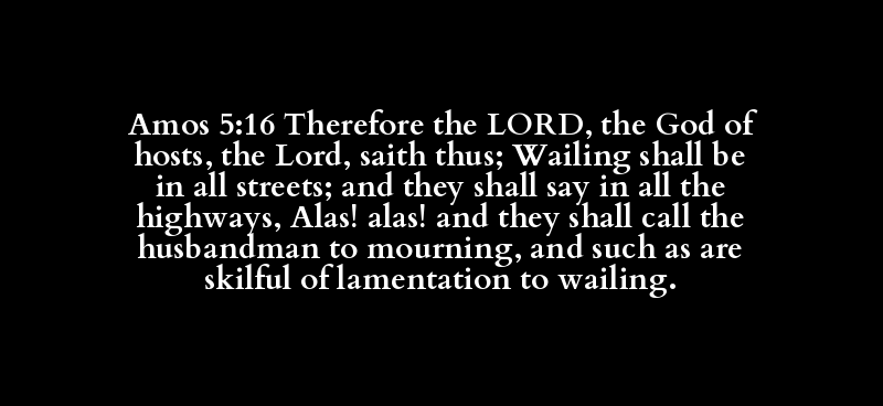 Amos 5:16 Therefore the LORD, the God of hosts, the Lord, saith thus; Wailing shall be in all streets; and they shall say in all the highways, Alas! alas! and they shall call the husbandman to mourning, and such as are skilful of lamentation to wailing.