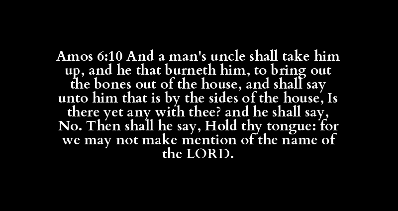 Amos 6:10 And a man's uncle shall take him up, and he that burneth him, to bring out the bones out of the house, and shall say unto him that is by the sides of the house, Is there yet any with thee? and he shall say, No. Then shall he say, Hold thy tongue: for we may not make mention of the name of the LORD.