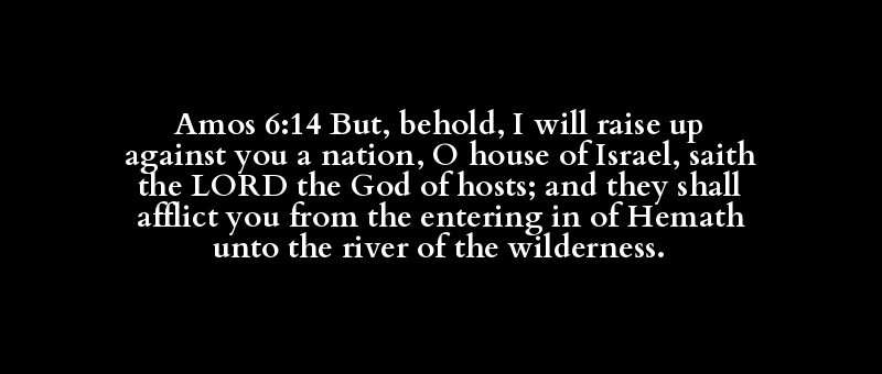 Amos 6:14 But, behold, I will raise up against you a nation, O house of Israel, saith the LORD the God of hosts; and they shall afflict you from the entering in of Hemath unto the river of the wilderness.