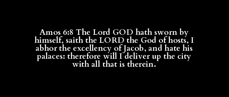 Amos 6:8 The Lord GOD hath sworn by himself, saith the LORD the God of hosts, I abhor the excellency of Jacob, and hate his palaces: therefore will I deliver up the city with all that is therein.