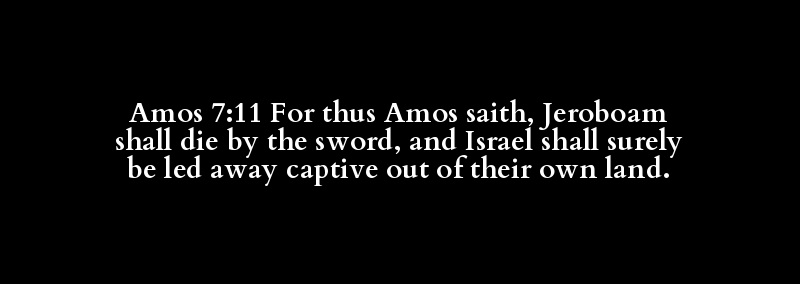 Amos 7:11 For thus Amos saith, Jeroboam shall die by the sword, and Israel shall surely be led away captive out of their own land.