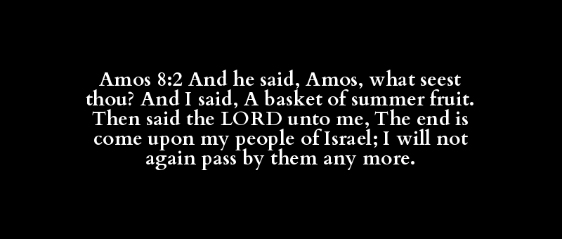 Amos 8:2 And he said, Amos, what seest thou? And I said, A basket of summer fruit. Then said the LORD unto me, The end is come upon my people of Israel; I will not again pass by them any more.