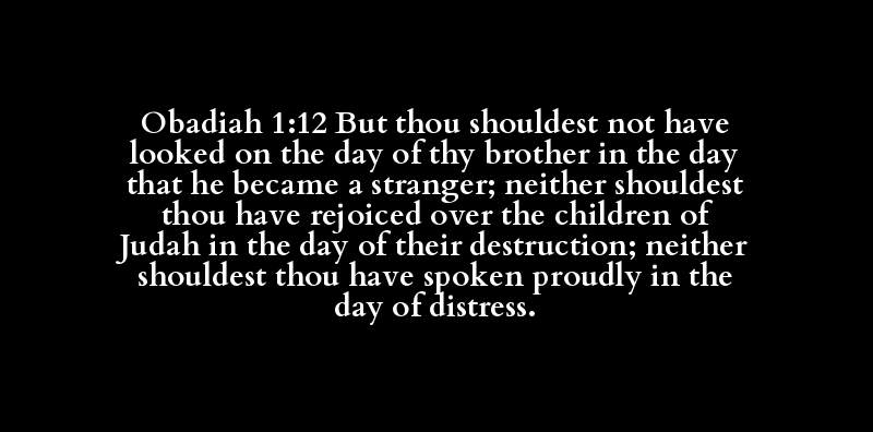 Obadiah 1:12 But thou shouldest not have looked on the day of thy brother in the day that he became a stranger; neither shouldest thou have rejoiced over the children of Judah in the day of their destruction; neither shouldest thou have spoken proudly in the day of distress.