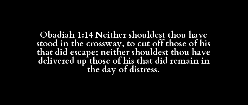 Obadiah 1:14 Neither shouldest thou have stood in the crossway, to cut off those of his that did escape; neither shouldest thou have delivered up those of his that did remain in the day of distress.