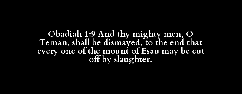 Obadiah 1:9 And thy mighty men, O Teman, shall be dismayed, to the end that every one of the mount of Esau may be cut off by slaughter.