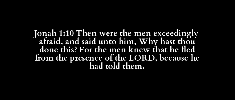 Jonah 1:10 Then were the men exceedingly afraid, and said unto him, Why hast thou done this? For the men knew that he fled from the presence of the LORD, because he had told them.