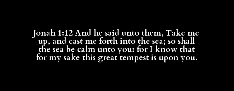 Jonah 1:12 And he said unto them, Take me up, and cast me forth into the sea; so shall the sea be calm unto you: for I know that for my sake this great tempest is upon you.