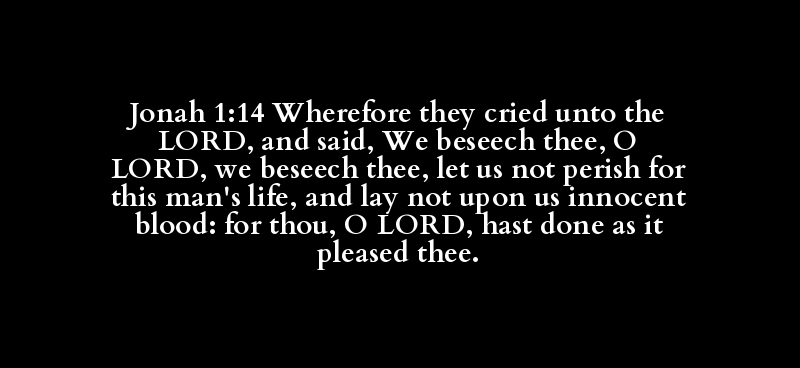 Jonah 1:14 Wherefore they cried unto the LORD, and said, We beseech thee, O LORD, we beseech thee, let us not perish for this man's life, and lay not upon us innocent blood: for thou, O LORD, hast done as it pleased thee.